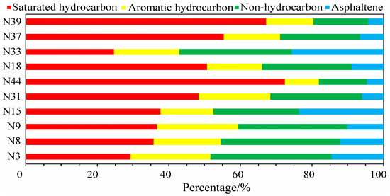 The contents of S1 range from 0.95 mg/g to 3.58 mg/g, with a mean of 1.84 mg/g. The percentages of chloroform bitumen “A” are 0.19–0.90%, with a mean of 0.58%. They are lower than those of the Shahejie Formation and the Lucaogou Formation and similar to those of the second member of the Kongdian Formation and the Qing 1 member [55]. The OSI values range from 16.0 mg/g to 68.1 mg/g (mean of 29.8 mg/g) and decrease with increasing TOC. The range of percentages of saturated hydrocarbons is 24.6–72.3%, the mean is 45.7%, and the range of aromatic hydrocarbon contents is 9.6–22.7%, with an average of 17.1% (Figure 11). These results are similar to those of the Shahejie Formation [55].