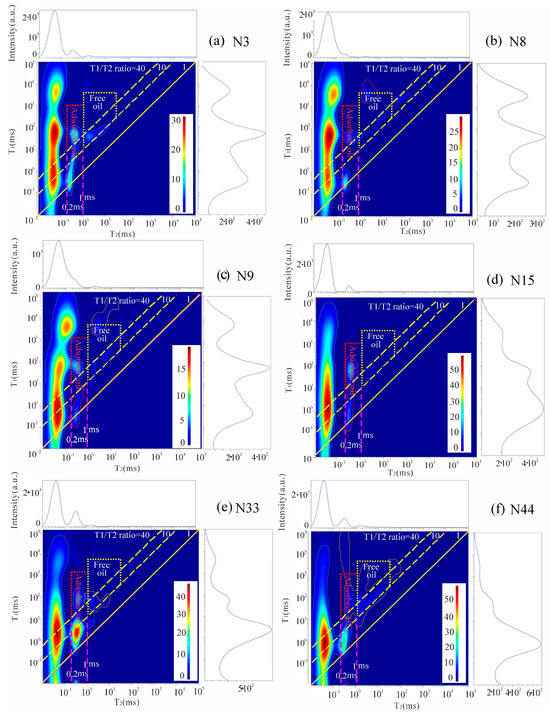 According to the cutoff times of T1 and T2, the NMR T1–T2 map was divided into three regions: kerogen, adsorbed oil, and free oil [33]. The T1–T2 maps (Figure 12) were compared with previous data. The cutoff values were determined: for 0 ms < T2 < 1 ms, T1/T2 > 40 was defined as the range of adsorbed oil, and T2 > 1 ms, T1/T2 > 10 was defined as the range of free oil. Furthermore, the NMR signal intensities of free oil and adsorbed oil were extracted. The NMR signal intensities of total oil range from 17.5 to 35.2 a.u./g of rock, with an average of 26.3 a.u./g of rock. The signal intensities of adsorbed oil range from 7.5 to 23.4 a.u./g of rock, and the proportion ranges from 29.4% to 84.0%, with a mean of 55.8%. The signal intensities of free oil range from 4.4 to 23.2 a.u./g of rock, and the proportions range from 15.9% to 70.6%, with an average of 44.2%. These values are higher than those in other regions of China [55]. The signal intensity of the adsorbed oil has a good correlation with DOM. In addition, the free oil has a good correlation with the OSI. These results show that DOM is dominated by adsorbed oil, consistent with the geochemical characteristics (Figure 13).
