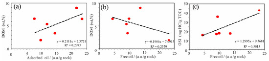 Relationships between shale oil mobility and DOM/OSI: (a) adsorbed oil vs. DOM; (b) free oil vs. DOM; (c) free oil vs. OSI.
