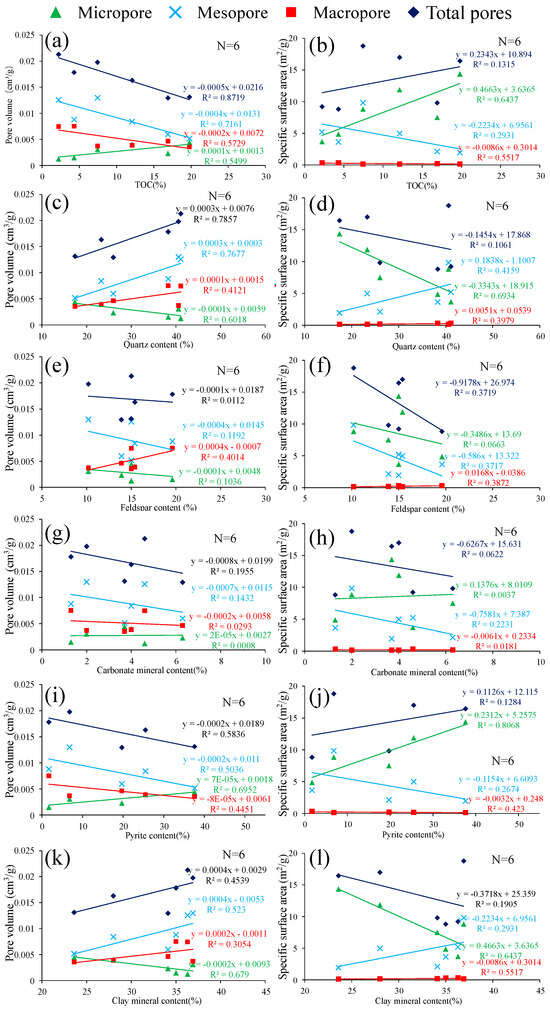 Quartz has a negative relationship with the PV (R2 = 0.60) and SSA (R2 = 0.69) of micropores, while quartz is well associated with the PV (R2 = 0.77) and SSA (R2 = 0.42) of mesopores and the PV (R2 = 0.41) and SSA (R2 = 0.40) of macropores. Moreover, quartz is positively correlated with the total PV (Figure 14c, R2 = 0.79) and negatively correlated with the total SSA (Figure 14d, R2 = 0.11). The above relationship indicates that the higher the quartz content is, the more macropores and mesopores there are. This is because a high content of quartz, as a rigid mineral, promotes the conservation of primary pores. Feldspar is well associated with the PV (R2 = 0.40) and SSA (R2 = 0.38) of macropores and is negatively associated with the PVs and SSAs of mesopores and micropores (Figure 14e,f). As a soluble mineral, the higher the feldspar content is, the more developed the dissolved pores. The correlations between carbonate minerals and the PV and SSA are not significant (R2 < 0.2), indicating that pores related to carbonate did not develop (Figure 14g,h). Pyrite is well associated with the PV (R2 = 0.70) and SSA (R2 = 0.81) of micropores but negatively correlated with the PVs (R2 = 0.50 and 0.45) and SSAs (R2 = 0.27 and 0.42) of mesopores and macropores. Furthermore, pyrite is negatively correlated with the total PV (R2 = 0.58) and positively correlated with the total SSA (R2 = 0.12) (Figure 14i,j). The development of pyrite is closely related to micropores. The content of clay minerals is negatively associated with the PV (R2 = 0.68) and SSA (R2 = 0.76) of micropores and positively correlated with the PVs of macropores (R2 = 0.31) and mesopores (R2 = 0.52), indicating that the pores of the related clay are mostly macropores and mesopores (Figure 14k–l).