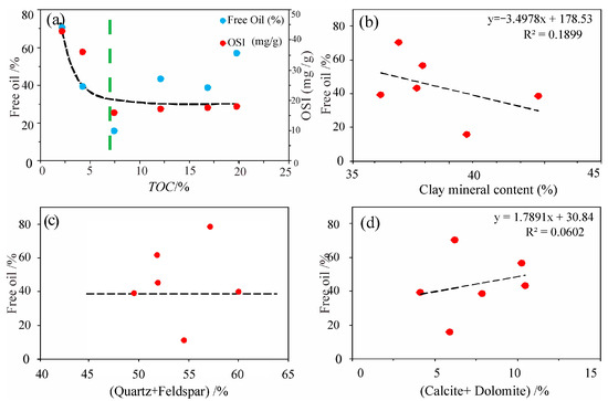 There is a significant negative correlation between the proportion of free oil and the TOC (Figure 16a). In particular, when the TOC > 7%, the ratio of free oil significantly decreases. Due to the strong interaction between OM/kerogen and oil, a considerable amount of oil is adsorbed and swelled by kerogen [56]. Thus, high OM abundance leads to the poor mobility of shale oil.