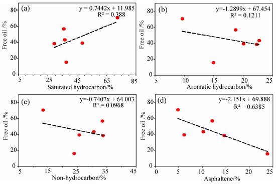 Relationship between free oil and crude oil composition: (a) free oil vs. saturated hydrocarbon; (b) free oil vs. aromatic hydrocarbon; (c) free oil vs. non-hydrocarbon; (d) free oil vs. asphaltene. The red circle represents the free oil and crude oil composition data of samples N3, N8, N9, N15, N31, N44.