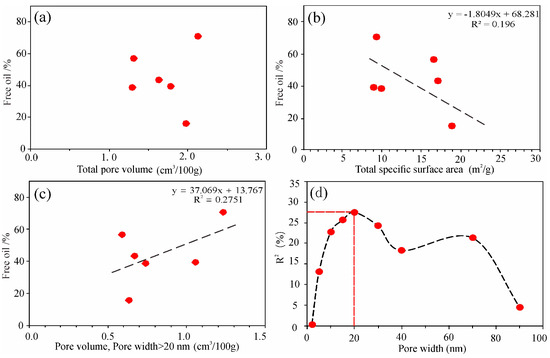 Relationship between shale oil mobility and PV/SSA: (a) free oil vs. total PV; (b) free oil vs. total SSA; (c) free oil vs. PV (pore width > 20 nm); (d) R2 vs. pore width. The red circle represents the data of free oil, PV and SSA from samples N3, N8, N9, N15, N31, N44.