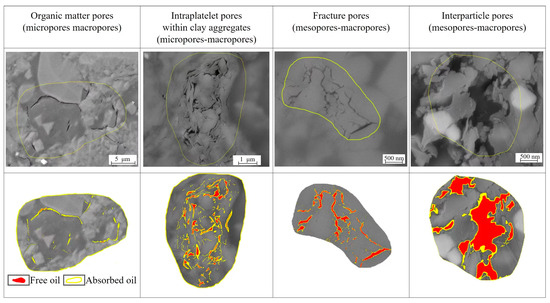 Due to its enormous resources, shale oil has attracted worldwide attention and has gradually changed the strategic pattern of world energy resources [1,2,3,4,5,6]. Shale oil primarily exists in the micro/nanopores of shale in the form of adsorbed and free states. Adsorbed oil is absorbed by OM or adsorbed on the surface of OM and mineral particles, while free oil mostly appears in pores and fractures. Generally, free oil flows easily, while adsorbed oil has more difficulty in flowing. The mobility of shale oil is directly influenced by the occurrence mechanism [7,8]. Therefore, investigating the pore structure and its internal oil occurrence characteristics is significant for shale oil sweet spot prediction and resource evaluation. Furthermore, the characteristics of shale oil occurrence are controlled by the rock composition (i.e., minerals and kerogen), crude oil composition, and pore structure.