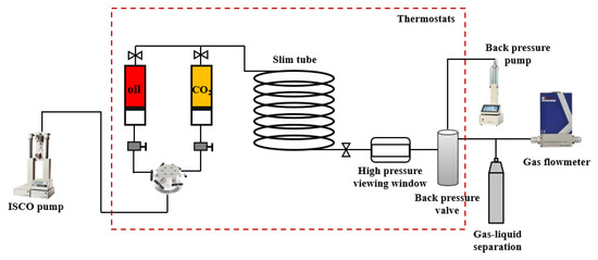 The miscible state of the CO2–crude-oil mixture significantly affects the effectiveness of the CO2 flooding. Consequently, slim-tube experiments were conducted to determine the minimum miscibility pressure and the near-miscibility pressure range, in order to determine whether the CO2 flooding in the target reservoir is in a miscible or near-miscible phase. As illustrated in Figure 1, the fine-tube experimental system comprises an ISCO pump, an intermediate container, fine tubes, a back-pressure valve, a return pump, and a flow meter, among other components. By evaluating the displacement efficiency at varying pressures, both the minimum miscibility pressure and the near-miscibility pressure range are ascertained.