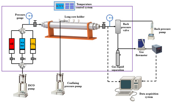 The long-core displacement experiment aligns more closely with actual conditions, rendering the experimental results more representative. Figure 2 provides a schematic diagram of the long-core displacement system, which comprises an ISCO pump, storage vessels, a long-core holder, a back-pressure valve, and a flow meter, among other components. By assessing the oil and gas production from advanced injection and continuous injection, the recovery and CO2 storage rates of various development methods were determined.
