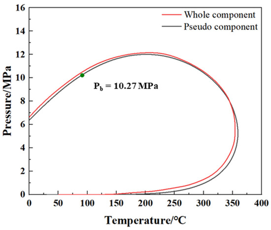 The phase change occurring during the dissolution and mass transfer process between the injected gas and formation fluid serves as the basis for accurately predicting the production performance of the gas injection development through the numerical simulation of multiphase and multicomponent systems, which can precisely characterize the phase behavior of the formation fluid. This study established a multiphase and multicomponent numerical model at reservoir scale based on geological characteristics and reservoir data, with the specific parameters delineated in Table 4. In alignment with the well pattern and well spacing utilized in Block M, a square well pattern with a well spacing of 425 m was employed for the injection and production wells. Development was facilitated through the use of a vertical well for injection and a horizontal well for production. Under the reservoir temperature 91.73 °C, the saturation pressure of the crude oil was 10.27 MPa. Based on the crude-oil composition data, the P–T phase diagram of all the components of the formation crude oil was calculated using the CMG-Winprop module (Figure 4), which is a coordinate graph that represents the changes in the system state parameters. It essentially serves as a graphical representation of the equation of state. The crude oil was divided into 10 pseudo-components through phase-state fitting (Table 5). Pseudo-components refer to the combination of components with similar properties as one component. The pseudo-component division results in a reduction in the number of components, which improves the speed of the numerical simulation and minimizes the impact on its accuracy. Figure 5 depicts the oil–water- and gas–liquid-phase relative permeability curves for the target reservoir. In the figure, Sw represents the water saturation, Sg signifies the gas saturation, and Krw, Krg, and Krl represent, respectively, the relative permeabilities of the water, gas, and liquid. Table 4 and Table 5, along with Figure 4 and Figure 5, provide a basis for the subsequent establishment of the numerical model.