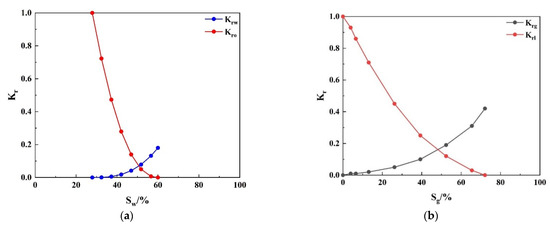 Relative permeability curves of tight-oil reservoir. (a) Oil–water relative permeability curve. (b) Gas–liquid relative permeability curve.