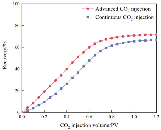 In the initial stages of continuous CO2 injection, the primary mechanism for oil recovery hinges on CO2 displacement. As some CO2 dissolves in the crude oil, it is imperative to establish a sufficient displacement pressure difference, leading to a concave-down curve for the recovery with escalating CO2 injection. With an increase in the CO2 injection volume, the CO2 begins to contribute to the expansion of the oil and the reduction in its viscosity, culminating in a sharp rise in the recovery. Upon the CO2 injection volume reaching 0.65 PV, gas breakthrough transpires, and the oil recovery mechanism predominantly involves extraction and carrying actions. This shift results in an obvious reduction in the increase in the recovery, which eventually stabilizes. Advanced CO2 injection involves injecting some CO2 before the gas drive, increasing the reservoir pressure, and interacting with the crude oil, which reduces its viscosity. Therefore, the gas drive efficiency is higher, and the recovery shows a nearly linear increase with the injection volume. The increased reservoir pressure and reduced oil viscosity make the front edge of the advanced CO2 injection more stable. When the injection volume reaches 0.7 PV, gas breakthrough occurs, and thereafter the recovery gradually increases until it stabilizes.