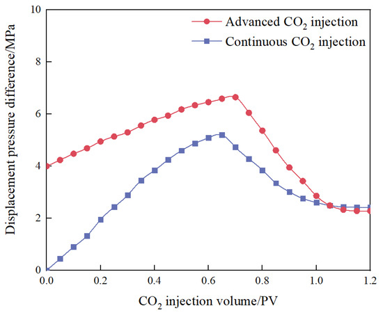 Figure 8 also illustrates the variation in the displacement pressure differences over time for continuous CO2 injection and advanced CO2 injection. The highest displacement pressure difference for continuous CO2 injection is 5.2 MPa, while for advanced CO2 injection, it is 6.65 MPa. Advanced CO2 injection demonstrates a higher oil displacement efficiency, and, in the late stage of the gas drive, only a small amount of crude oil remains in the core pores, resulting in low gas flow resistance and a lower displacement pressure difference. These experimental results indicate that, under the same conditions, advanced CO2 injection performs better in terms of the gas displacement efficiency compared to continuous CO2 injection, and it also maintains a more stable displacement pressure difference.