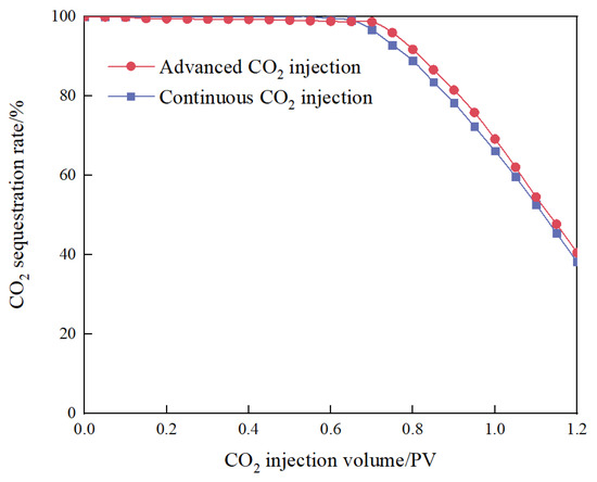 By evaluating the injection and production of CO2, the CO2 storage efficiency and volume for both continuous and advanced injection could be calculated. Figure 9 illustrates the variation in the CO2 storage efficiency in correlation with the injection volume for both injection methodologies. In the initial stages of continuous injection, the CO2 had not yet achieved breakthrough, and crude oil infused with CO2 had not been produced, leading to a 100% CO2 storage efficiency. As the injection volume escalated, dissolved CO2 in the crude oil began to be produced, prompting a slight decrement in the CO2 storage efficiency, which fell below 100%. Upon the occurrence of gas breakthrough, the CO2 storage efficiency precipitously declined, ultimately registering at 38.22% for continuous injection. For advanced CO2 injection, because the CO2 was injected ahead of time and interacted with the crude oil, some CO2 was already produced with the oil during the early gas displacement phase, leading to a CO2 storage efficiency below 100%. When gas breakthrough occurred, the CO2 storage efficiency rapidly decreased, reaching 40.51% in the end.