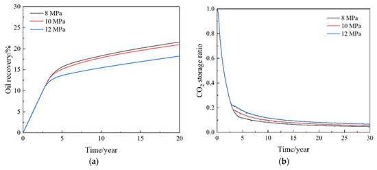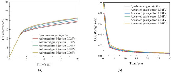 Oil recovery and CO2 storage ratio at different advanced-injection volumes. (a) Oil recovery. (b) CO2 storage ratio.