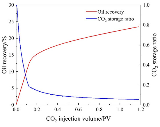 Relationship between oil recovery, CO2 storage ratio, and injection volume.
