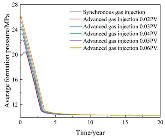 In conjunction with the average formation pressure (Figure 13), it is observed that, at an injection volume of 0.04 PV, the degree of the formation pressure uplift is more favorable. Should the injection volume continue to increase, it would result in elevated injection costs and excessive production pressure differentials, which are adverse to oilfield production. Therefore, considering the optimal indicators, such as the oil recovery, CO2 storage ratio, and average formation pressure, the reasonable advanced-injection volume is determined as 0.04 PV.