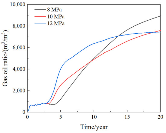 By comparing the oil recovery and CO2 storage ratio of different bottom-hole pressures, the development effect was further analyzed. When the bottom-hole pressure is 8 MPa and 10 MPa, the oil recovery is higher, and a higher bottom-hole pressure can obtain a higher CO2 storage ratio (Figure 14). However, when the formation pressure drops below the fluid saturation pressure (10.27 MPa), the formation crude oil will undergo degassing, increasing the density and viscosity of the crude oil, which is not conducive to subsequent gas injection development and adjustment. Simultaneously, at a bottom-hole pressure of 10 MPa, the gas–oil ratio does not escalate rapidly, the effect of gas channeling is minimized, and the sweep efficiency of the injected gas is higher (Figure 15). Therefore, taking into account both the oil recovery and CO2 storage ratio comprehensively, a bottom-hole pressure of 10 MPa is recommended for the production well.