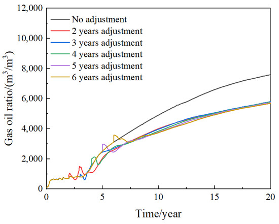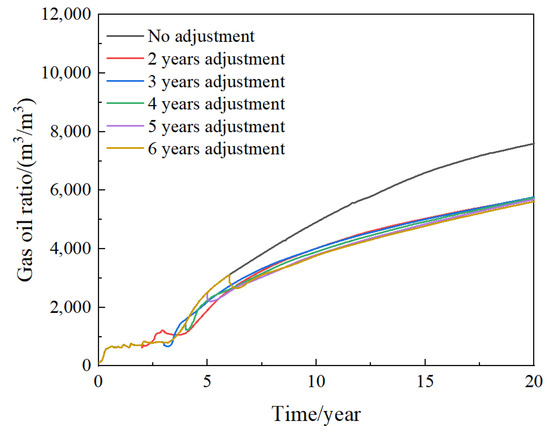 Similar to the five-point well pattern, the row well pattern significantly enhanced both the oil recovery and CO2 storage ratio after 20 years of development (Figure 21), showcasing the positive impact of this adjustment mode on gas injection development. Concurrently, a notable reduction in the gas–oil ratio was observed (Figure 22), demonstrating that this adjustment mode can also effectively mitigate gas channeling.