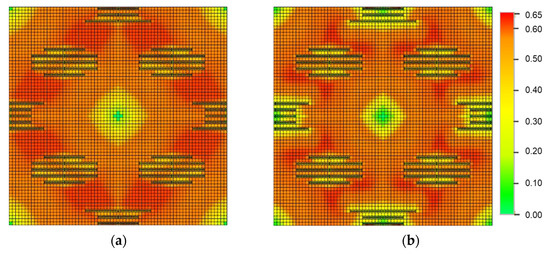 Oil saturation distribution after 20 years of development. (a) Square well pattern. (b) Transferring to the five-point well pattern.