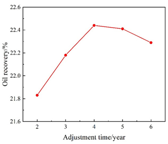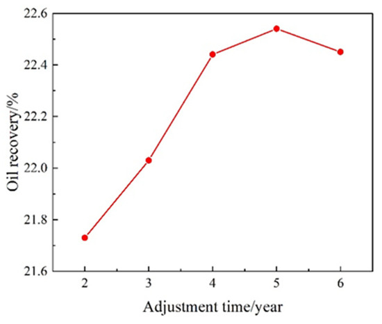By comparing the oil recovery at the different times of well pattern adjustment (Figure 20), it can be seen that the highest oil recovery of 22.44% was achieved when the well pattern adjustment was conducted after 4 years of gas injection development. Other development indicators exhibited minor differences for varying adjustment times. Therefore, the optimal timing for transitioning from the square well pattern to the five-point well pattern is identified as 4 years after the gas injection development.