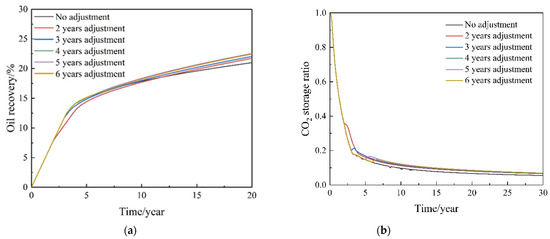 Oil recovery and CO2 storage ratio after transferring to the row well pattern. (a) Oil recovery. (b) CO2 storage ratio.