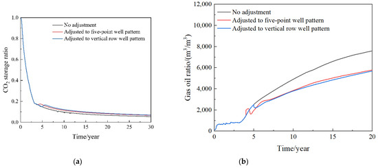 CO2 storage ratio and gas–oil ratio after transferring well pattern. (a) CO2 storage ratio. (b) Gas–oil ratio.
