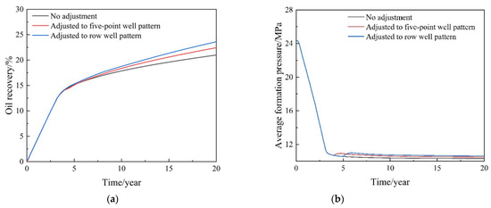 Development indicators after transferring well pattern. (a) Oil recovery. (b) Average formation pressure.