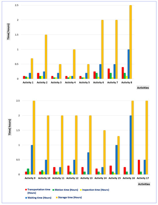 Building upon the evaluation results from the preceding subchapter, recommendations for enhancements are put forth for six activities falling within the MCE % range of 40–60%, with the goal of reducing nonvalue-added time waste based on correlation values exhibiting a moderate relationship within the range of 0.4–0.599. Specifically, the areas that require improvements are the time parameters associated with inspection and storage, which lack added value. These improvement recommendations have been summarized and are presented in Table 10.