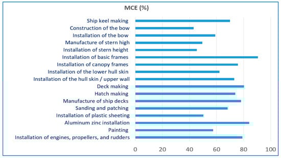 Based on the calculations presented in Table 7, the obtained TCT value is 364.21 h. Additionally, the MCE value achieved 67.08%. These results indicate that the traditional shipbuilding process in the TSI still exhibits a significant amount of waste, as evidenced by the identified NVAT value of 44.98 h derived from WT, TT, MT, IT, and ST activities in the TSI. For a more comprehensive understanding of the correlation between the MCE value and each specific work activity in traditional shipbuilding in the TSI, please refer to Figure 3.