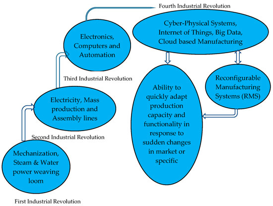 These are the manufacturing systems that have been adopted in recent times to conceive the idea of Industry 4.0 [8]. A common MCS is the computer numeric control machine center system, where the positioning and feeding of tools, products, fixtures and or pallets is automatically performed, while robots or advanced mechanized automated systems perform loading and unloading [9]. Moreover, based on the concept of group technology, a fixed CMS is created to carry out the manufacturing of a certain set of product families [10]. The FMS is designed for a specific group of a product family; however, it is highly automated in terms of transportation, distribution and production flexibility [11]. AMS is designed to share a common database related to customer demands and organization facilities, and to create strategies to respond quickly to dynamic market/customer needs [12]. RMS is different from cellular, agile and FMSs. RMS focuses on personalized flexibility rather than manufacturing flexibility [13]. RMS is a collection of reconfigurable-machine centers, tools, and inspection and material handling systems. However, as the most advanced system, RMSs are the closest to Industry 4.0 [14]. Figure 1 highlights the evolution of manufacturing concepts and manufacturing systems in different eras of industrial revolutions.