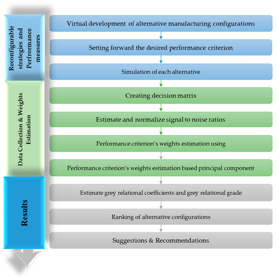 It is evident from the published literature that most manufacturing companies invest in advanced manufacturing systems as they feel that the existing procedures, processes and technology are insufficient to satisfy the current or potential demands [48]. Companies do not see the advantage of committing to one particular product, especially in a dynamic market that is more open and competitive: where users/buyers are aware of and have better choices. Although, in the longer term, these manufacturing organizations need to be smart enough to develop their production systems intelligently enough to learn how to create things faster to keep pace with the anticipated demand, and to continue to overcome severe decision-making challenges. The fluctuating market demand mainly includes variations in product geometry and manufacturing constraints. Among the several existing strategies, the reconfigurable manufacturing system (RMS) is the choice, owing to its numerous benefits for Industry 4.0. This work aims to conduct a study for analyzing and ranking various potential configurations in reconfigurable manufacturing systems. The goal is to provide an evaluation framework for alternative manufacturing configurations to meet the fourth industrial revolution. A simulation approach is used to demonstrate the efficiency of each feasible production configuration. In this work, an entropy-based grey relational formulation is applied to analyze different configurations and select the most suitable one based on the customers’ preferences. The research discussed here considers the changes in the market demand, including product varieties, and enacts an objective approach focusing on entropy weight coupled with grey relational analysis. The sensitivity analysis is also performed by deriving the different weights through principal component analysis and justifying the ranking order acquired with entropy weight coupled grey relational analysis.