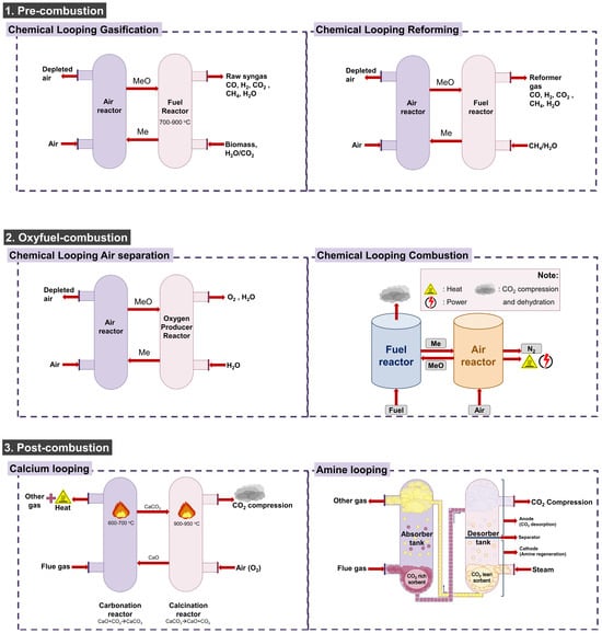The chemical looping process (CLP) for various carbon capture strategies has attracted the interest of researchers. In principle, CLP separates the conventional technique into more than one sub-reaction and applies the redox cycle [36]. Fundamentally, carbon capture technology using CLP utilizes metal-oxide-based oxygen carriers in conversion of carbonaceous fuels through two reactors for reduction and oxidation reactions in a redox loop [7]. Besides, reaction and regeneration in the CLP can involve the intermediate materials like metal oxides for oxidation of fuel known as the chemical looping full oxidation (CLFO) [37]. Application of CLP is favorable to be applied for gaseous fuels due to its great thermodynamic properties [7]. Several applied CLP methods for pre-, post-, and oxy-fuel combustion strategies are illustrated in Figure 2.