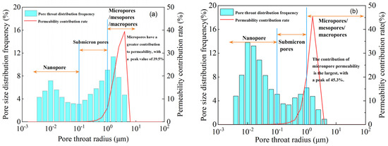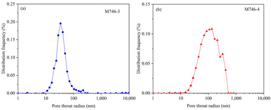 Matrix pore size distribution based on MAPS: (a) Sample M746-3, well MA604 at a depth of 3898.2 m; (b) Sample M746-4, well MA152 at a depth of 3898.2 m.