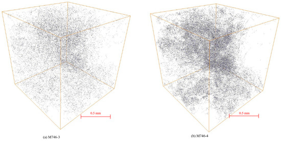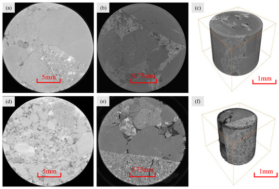 CT images are 16-bit grayscale images with a resolution of 2048 × 2048 pixels, and the voxel gray values are associated with the mineral components. Regions with high gray values correspond to high-density material, representing skeleton components, while regions with low gray values correspond to pores. The section diagrams of the core samples are presented in Figure 2a,d. It is evident from the diagrams that the sample exhibits pronounced heterogeneity. Among these, sample M746-3 displays a significant gravel size and high gravel content, with minimal intergranular pores and intergranular interface fractures, while sample M746-4 demonstrates relative homogeneity, where intergranular pores can be observed; however, most of these pores are filled, and the main type of pores were interstitial micropores. The microporous structures of the two samples exhibit intricate spatial modal characteristics, with significant variations in both size and micropore development across different locations within the samples. By counting the number of pixels corresponding to the pore part and the total number of pixels in the sample bulk area, the porosity of the section was calculated. Sample M746-3 demonstrates a porosity of 0.3%, while sample M746-4 exhibits a higher porosity of 0.9%. These values correspond to 4.5% and 16.1%, respectively, when compared to the helium measured porosity. It should be noted that most pores are indistinguishable under this resolution (13 μm/voxel).
