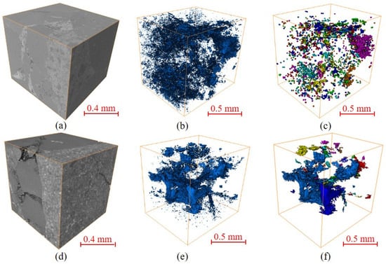 The 2-D grayscale images of the 2 mm sample were sequentially overlaid and merged to generate a 3-D grayscale representation (Figure 3a,d). A segmentation algorithm was employed to binarize the digital core’s three-dimensional gray image (Figure 3b,e). The transparent region represents the rock skeleton, while the blue area corresponds to pore space, enabling clear visualization of pore distribution within the rock skeleton. Pore shapes in the conglomerate sample are irregular with varying pore–throat sizes.