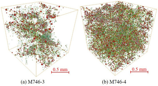 To establish a pore network model, it is essential to simplify the pore space by considering regions with a larger size as pore bodies and regions connecting these pore bodies with a smaller size as throats. This division of the pore space into a combination of pore bodies and throats facilitates the extraction of characteristic parameters and enables numerical simulation of conductivity characteristics, thereby enhancing storage efficiency and facilitating multi-scale coupling of pore information [26]. Currently, the most widely used method for constructing such models is the maximum sphere algorithm proposed by Silin, Dong, and Blunt [27]. By employing maximum sphere analysis along with cluster analysis to identify pores and throats, it becomes possible to extract the desired pore network model. The maximum ball algorithm was used to extract the coarse-scale pore network model, and Figure 4 illustrates the results, with balls representing pores and tubes representing throats. From this model, it can be observed that the micro-CT identified pore network exhibits disconnectedness due to tight lithology and strong heterogeneity. Sample M746-4 consists of numerous small-sized pores and throats, resulting in a relatively low measured porosity. Conversely, sample M746-3 contains a significant number of large-sized pores and throats, leading to a comparatively higher measured porosity.