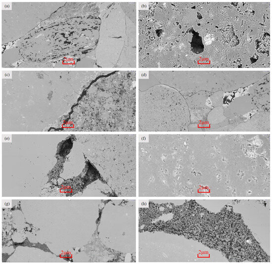 The sample M746-3 exhibits a scarcity of intergranular pores, with predominant pore types being albitite dissolution pores, micropores within the gravel, and intergranular interfacial fractures (Figure 5a–c). The strong compaction of grains has resulted in a minimal proportion of intergranular pores, where macroscopic intergranular pores contribute insignificantly to the flow channel. Considering the mineral composition depicted by energy spectrum analysis, sample M746-3 is rich in calcite (Figure 5d), indicating that the microcracks shown in Figure 6 are elongated cleavage fractures of calcite particles. These microcracks may have formed through shear dislocation or dissolution processes during various geological tectonic events, as suggested by previous studies on calcite characteristics. The presence of such microcracks positively facilitates communication between micron-scale spherical micropores and nano-scale solution pores while serving dual functions as both pores and throats. Conversely, the main pore types observed in sample M746-4 include residual intergranular pores, intragranular pores, and kaolinite interstitial pores (Figure 5e–h). These pores primarily serve as storage spaces and can connect with adjacent nanoscale micropores. However, it should be noted that a single pore type alone cannot independently form a seepage channel due to poor pore connectivity in both samples. Our findings reveal that the tight conglomerate reservoir in the study area exhibits complex multi-scale and multi-type pore structures with significant spatial variations. Additionally, numerous submicron intergranular residual pores and nano-scale dissolution pores were identified. Therefore, when constructing a comprehensive pore network model for conglomerate reservoirs, it is crucial to consider multiple scales to accurately capture the internal pore structure characteristics and microscopic flow behavior of fluids.