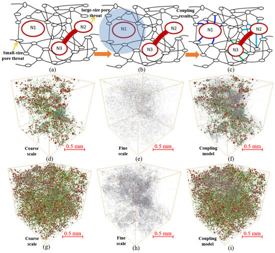 Schematic diagram of the pore network coupling: (a–c) schematic diagram of coupling algorithm; (d–f) coupling process for sample M746-3, well MA604, 3898.2 m; and (g–i) coupling process for sample M746-4, well MA604, 3898.2 m.