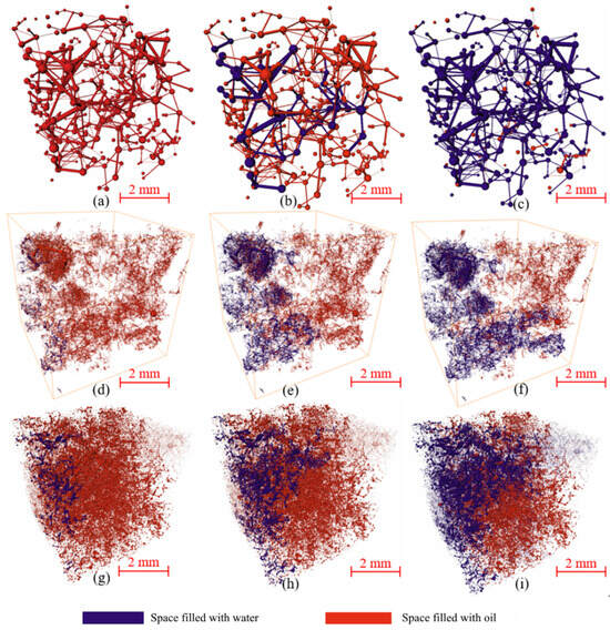 Water flooding simulation in sandstone and conglomerate samples: (a–c) displacement process of sandstone sample; (d–f) displacement process for sample M746-3, well MA604, 3898.2 m; and (g–i) displacement process for sample M746-4, well MA152, 3898.2 m.