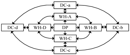 In the traditional logistical distribution network, the distribution mode of goods has been preset prior to entering the logistical network. The source and destination of any transport have experienced advanced planning, and the goods are passed layer by layer from the delivery point (DP), warehouse (WH), distribution center (DC), and terminal node to the consumers. However, with the aid of PI, data-driven, connective, extensively collaborative and efficient features can form a highly efficient logistical distribution model as shown in Figure 1. Each peer distribution between nodes is closely interconnected, and establishes a logistical network environment that is widely shared between each other, and thus has many path selections, a real-time dynamic adjustment of the new key characteristics, and increases the distribution of various possibilities. It helps to explore more flexible distribution solutions to further reduce the waiting time and inventory cost of goods at each node. To explore the best logistical distribution method based on PI, the following three core factors, namely PI infrastructure, distribution route, and transshipment standard, are analyzed to effectively depict the urban logistical distribution model of PI. (See Figure 2).