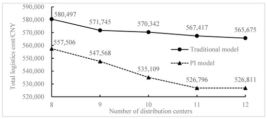 - The Core Factors Analysis: A surge in demand for logistical service providers and consumers has resulted from the gradual replacement of offline retail with online shopping. However, serious challenges have been brought about by “Shopping Day” blowing up and new epidemic outbreaks, which could cause transportation disruption on the elasticity of the logistical network. Experiments are carried out by gradually increasing the number of distribution centers from eight to twelve with a step size of 1, while keeping the same parameters in Table 1 and Figure 3, in order to further investigate the impact of the scale of logistical infrastructure and emergency interruption events on the cost advantage of the logistical distribution model in PI city. For simulation, the random outage chance for each warehouse was incrementally raised from 0.1 to 0.25, with a 0.125 step size. From Figure 6, it can be seen that the size of the logistical infrastructure for distribution has a positive promoting effect, lowering the total cost of the distribution center to give up the number of PI is higher at the end of the logistical distribution model of flexible selectivity, so the PI total cost of logistics and distribution center is roughly inversely proportional to the size number. Therefore, with each increase in a distribution center, the cost of distribution costs an average of about CNY 720.90. With the largest decrease in total cost of CNY 14,758.52, the cost optimization rate was 2.55%, only 48% of the PI logistical model improvement, and the visible PI cost optimization model was significantly higher than that of the traditional logistical model, so the expansion of the scale of the distribution center also brought some distribution advantages for the traditional logistical model. It can be seen from Figure 7 (taking the mean value after 10 simulations) that when the random interruption probability of each warehouse increases, the logistical network risk, and uncertainty increase, and the total cost of PI logistical distribution shows an increasing trend. When the interruption probability increases from 0.10 to 0.25, the total cost increases from CNY 555,116.96 to CNY 560,277.74, but the PI logistical model does not affect the optimization ability of the total cost. This is mainly reflected in the fact that the cost difference value and cost difference rate of the PI logistical model and traditional logistical model continues to rise, especially in the interval of interruption probability [0.10, 0.15] optimization increases significantly. Compared with the traditional logistical model, the total distribution cost savings of the PI logistical model are increased by CNY 6940.11, and the savings rate is increased by 1.23%. Moreover, the savings rate is consistently higher than 5.00% when the outage probability is greater than 0.15, which shows that PI has good robustness to sudden logistical outage events, while the traditional logistical distribution model has to start an emergency response when interruption occurs and to recover the distribution supply through manual allocation, which lacks good fault-tolerance. While comparing with the traditional logistical distribution model, Figure 6 and Figure 7 comprehensively show that the distribution of scale expansion and interruption probability increases when the PI cost savings rate has a high level of the model, the maximum of 6.87% and 5.55%, respectively. This further shows that the advantages of the PI logistical model in the escalating scale of logistical infrastructure and emergencies that frequently occur are still preserved. The cost and elasticity advantages are magnified under large-scale and highly intrusive external conditions.