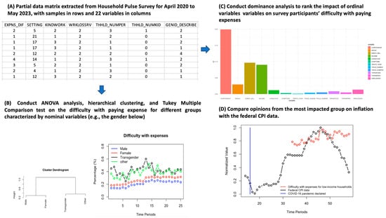 In order to address the aforementioned knowledge gaps, this study provided a systematic investigation of inflation-related data obtained from the Household Pulse Survey to study people’s perceptions of inflation during the COVID-19 pandemic. In particular, historical survey data were extracted for 25 periods, from August 2021 (i.e., when data for difficulty with paying expenses was first available) to May 2023 (i.e., when the federal COVID-19 PHE declaration ended). Twenty-two variables, including demographic and socioeconomic factors, household information (e.g., household income and household sizes), COVID-related factors (e.g., symptom severeness), and economic-related variables (e.g., types of work, food sufficiently, and difficult with paying expenses), were extracted for each sample. These data were, in turn, used for time profiling and cluster analysis to evaluate similarities and differences between different demographic and socioeconomic groups for the difficulty with paying expenses. ANOVA analysis [,,,] was further used to test possible significance in these differences, such as expense difficulty between population groups across different states, demographics, and socioeconomic status. The Tukey’s Multiple Component [,] test was used to determine where these significant differences lie. The relative importance of different quantitative factors (e.g., age, income, and education level) on inflation concerns was determined through dominance analysis [,]. The difficulty with paying expenses for a group associated with the most dominant factor was compared with federal data such as CPI to investigate whether CPI data correctly reflected survey participants’ opinions on inflation. The results from this study should empower policymakers to target specific demographic and socioeconomic groups for financial assistance in the post-COVID era and potential future pandemics.