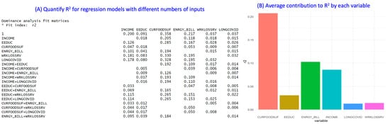 While ANOVA analysis and Tukey’s Multiple Comparison tests were conducted for nominal variables that represent categories with no inherent order or ranking, dominance analysis was implemented to investigate the impact of ordinal variables that can be quantified by numerical values on the opinions of survey participants for inflation. Dominance analysis is one of the most common methods that compare the relative importance of predictors/input variables in the framework of regression models []. For the purpose of illustration, Figure 3 shows the dominance analysis of partial ordinal variables to rank their impacts on people’s view of difficulty in paying expenses (repressed by EXPNS_DIF). Dominance analysis (R command dominanceAnalysis) built one-input linear regression models for each input first and calculated the R2 for each model. For example, the R2 for the linear model EXPNS_DIF = a0 + a1 × INCOME is 0.2 (i.e., the first value in the column for INCOME in Figure 3A). R2 was increased by 0.126 if INCOME is added into the two-input linear regression model EXPNS_DIF = a0 + a1 × EEDUC + a2 × INCOME. This increase in R2 quantified the contribution of adding INCOME into the model with education level (i.e., EEDUC) as the only input. This was repeated to attain the increase in R2 for the other two-input linear regression models with INCOME as one of the two inputs. This step was repeated for three-input and more-input linear regression models. The average increase in R2 due to the addition of INCOME into the linear regression models was quantified in Figure 3B. This value and the values for other inputs in Figure 3B were then used to rank the inputs for their impact on people’s opinions on difficulty with paying expenses.
