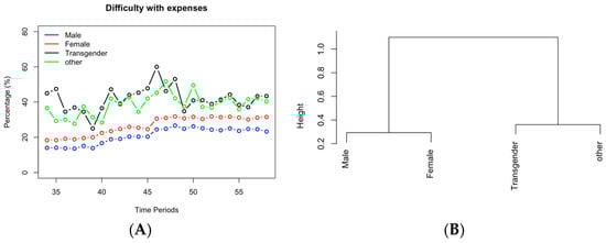 (A) the percentage of survey participants from different gender groups expressing difficulty with paying expenses; (B) the result of hierarchical clustering of different gender groups based on the percentage profiles shown in (A).