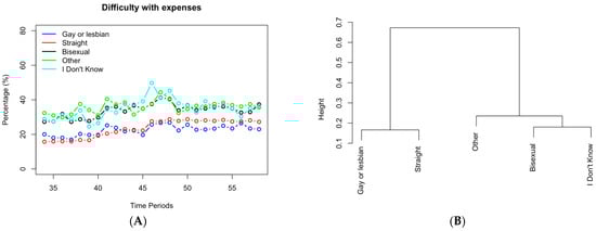Figure 6 shows the percentage of gay/lesbian, straight, bisexual, and other people who struggle with difficulty with expenses. The “Other” group shown in Figure 6 represents people who selected “Something else than gay/lesbian, straight and bisexual” as their sexual orientation, while the “I don’t know” group represents those choosing “I don’t know” as their answers. It seems from Figure 6A that the “I don’t know” group struggles the most, followed closely by the other and bisexual groups. The straight and gay or lesbian groups are clustered together in both Figure 6A,B. Through Tukey’s Multiple Comparison test, it seems that the groups clustered together (Gay or lesbian and straight, other and bisexual, and “I don’t know”) do not have a significant difference (p-value > 0.05). A significant difference was indicated between the groups from these two clusters (p-value < 0.05).
