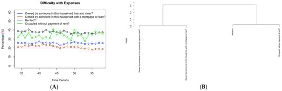 It can be seen from Figure 7A that the people who have had the most difficulty with expenses relating to their marital status are the people who have separated, followed by divorced, never married, widowed, and then finally, the people with the least difficulty are the people that are still married. However, a generally upward trend with difficulty with expenses was observed for all of the people regardless of marital status before Period 20. The ANOVA analysis concludes that there is a significant difference between the groups with different marital statuses (p-value < 0.05). Tukey’s Multiple Comparison test confirmed significant differences were observed between the groups with different marital statuses. The clustering diagram in Figure 7B shows the similarity between the marital status groups. Consistent with Figure 7A, the separated group and the married group were separated from the other three marital groups.