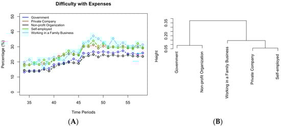 It can be seen from Figure 9A that different employment sectors seem to be having similar trends of difficulty with expenses until about Period 45 to Period 48, where those working in a family business had spikes in difficulty with expenses. The ANOVA analysis indicated a significant difference between sectors of employment in their difficulty with expenses (p-value < 0.05). However, according to Tukey’s Multiple Comparison test, some groups did not have a significant difference between them. Such groups included non-profit organizations and government (p-value = 0.86), self-employed and private companies (p-value = 0.99), working in a family business and private company (p-value = 0.76), and working in a family business and self-employed (p-value = 0.94). The results are reflected in Figure 9B, in which government and non-profit organizations are clustered together, and the other three (i.e., working in a family business, private company, and self-employed) stay in the same branch.