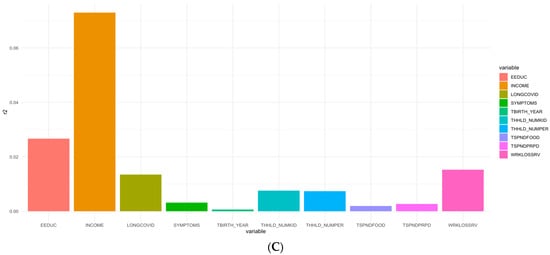 The difficulty with paying expenses was selected as the output for the dominance analysis, with other 12 ordinal variables as the inputs (i.e., potential factors influencing people’s opinions on difficulty with paying expenses). Figure 11A shows Household food sufficiency (for the last 7 days, represented by CURFOODSUF) as the most important factor influencing people’s difficulty with paying expenses. It is followed by difficulty in paying the full energy bill (represented by ENRGY_BILL), total household income (represented by INCOME), and educational attainment (represented by EEDUC). Food sufficiency is a primary concern when lacking the ability to pay. This may explain its central role in influencing people’s opinion on difficulty with expenses. Struggles with energy bill payments do not come as a surprise when looking at expense difficulties due to their contribution to household expenses. The total household income greatly determines the ability to pay for basic expenses, including food and energy bills. Educational attainment may influence people’s opportunities to find jobs with decent incomes.