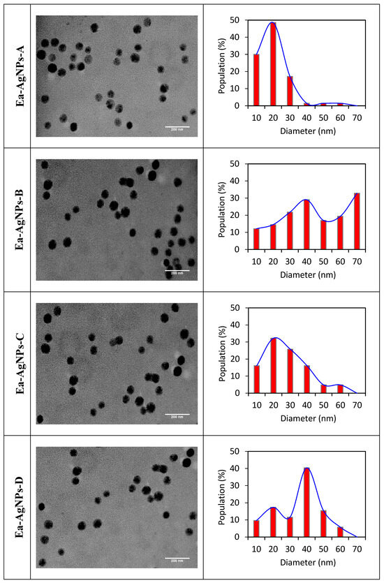 The morphologies and sizes of the nanoparticles synthesized under light radiation were examined using TEM. Figure 2 illustrates representative TEM micrographs of the four synthesized nanoparticles, clearly demonstrating their spherical morphologies. The size distribution histogram obtained from the TEM scans illustrates their effective dispersion and fairly consistent sizes; the size of an average particle ranged from 15 nm to 45 nm. This measurement was obtained through the digital analysis of TEM images containing a minimum of 100 particles (Figure 3). Notably, the nanoparticles synthesized from the ether extract Ea-AgNPs-B appeared to be smaller than those synthesized from the chloroform extract Ea-AgNPs-C, methanol extract Ea-AgNPs-D, and hexane extract Ea-AgNPs-A.