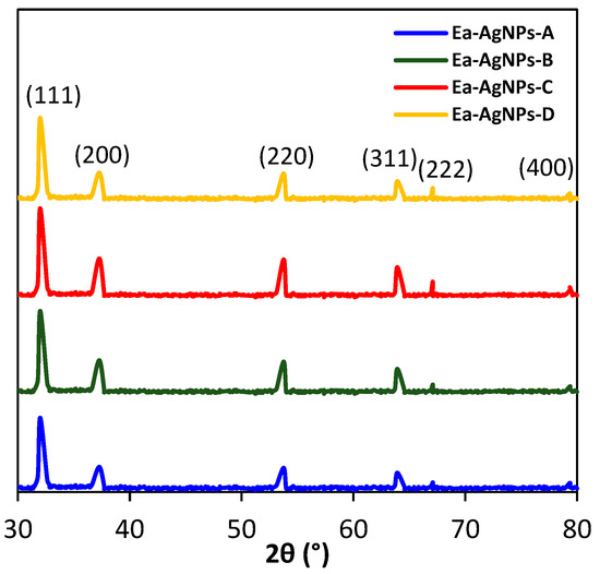 Figure 4 displays the XRD patterns of the four silver oxide nanoparticles synthesized using the environmentally friendly method: Ea-AgNPs-A, Ea-AgNPs-B, Ea-AgNPs-C, and Ea-AgNPs-D. The patterns exhibit strong, intense, and sharp peaks at 2θ values of 32.17, 37.31, 53.80, 64.08, 67.29, and 79.55. The observed peaks in the XRD patterns correspond to the crystallographic planes (111), (200), (220), (311), (222), and (400). These XRD patterns indicate that the synthesized nanoparticles possess a face-centered cubic system with lattice parameters of a = b = c =4.816 and α = β = γ = 90°. The presence of a high-intensity peak at the (111) plane suggests that the nanoparticles exhibit a preferred growth orientation in that direction. Furthermore, this peak indicates the highly crystalline nature of the synthesized nanoparticles [30,31,32].