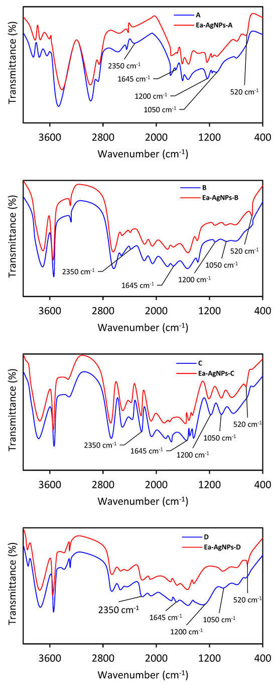 To identify the functional groups involved in the synthesis of the silver nanoparticles, a FTIR analysis was performed. The control spectra of extracts A, B, C, and D exhibited multiple peaks, indicating the complex nature of their chemical composition. The intensities of the bands in different regions of the spectra of both the extracts and their corresponding silver oxide nanoparticles were analyzed and are presented in Figure 6. Generally, there was a slight shift observed in the nanoparticle peaks compared to the corresponding extracts, particularly in the regions around 2350, 1645, 1200, and 1050 cm−1. The peak at around 2350 cm−1 can be attributed to N-H stretching or C=O stretching vibrations [35]. Three peaks located at approximately 1645, 1200, and 1050 cm−1 may correspond to the stretching vibrations of the C-O-H, OH, and C=O bonds present in polyphenols or carboxyl compounds [36,37,38]. These peaks suggest the involvement of these polyphenols in the reduction process during nanoparticle synthesis. Another significant observation was the well-defined peak observed in the spectra of all four nanoparticles—Ea-AgNPs-A, Ea-AgNPs-B, Ea-AgNPs-C, and Ea-AgNPs-D—at around 520 cm−1, indicating the formation of silver oxide (AgO) [39].