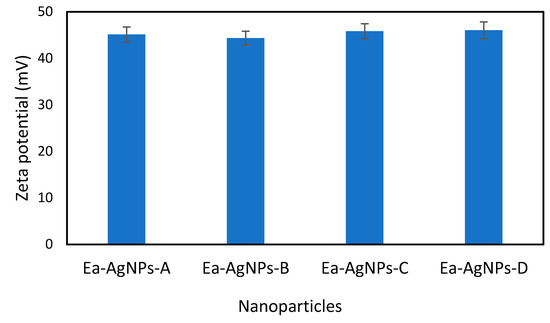 The zeta potential analysis provided a crucial parameter for determining the stability of the nanoparticle suspensions. For a physically stable nanoparticle suspension to be stabilized solely by electrostatic repulsion, a zeta potential of ±30 mV is required as a minimum. The results of the analysis of the Zeta potential of the synthesized silver oxide nanoparticles were as follows: −45.1 ± 1.6 mV for Ea-AgNPs-A; −44.3 ± 1.5 mV for Ea-AgNPs-B; −45.8 ± 1.6 mV for Ea-AgNPs-C; and −46.0 ± 1.8 mV for Ea-AgNPs-D (Figure 7). These negative Zeta potential values indicate that the silver nanoparticles in each of the samples are negatively charged. In this case, higher values in terms of absolute magnitude indicate greater dispersion stability, suggesting stronger repulsion between particles, which prevents their aggregation. According to the means produced by the ANOVA test, the nanoparticle samples show no statistical difference at 5%, indicating a similar dispersion stability for all four samples.
